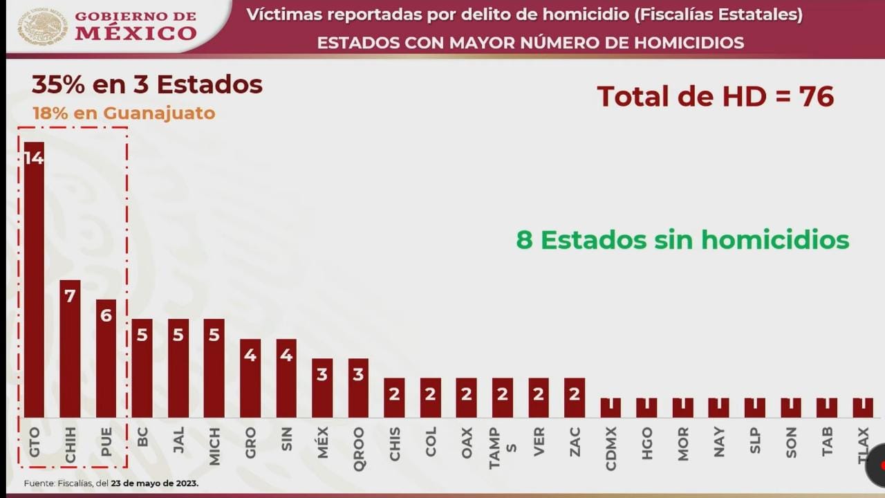 El primer dato que expuso fue el alusivo al número de víctimas de homicidio registrados el 23 de mayo; de acuerdo con la información suministrada por la Fiscalía General del Estado (FGE), en San Luis Potosí solo se registró una víctima de homicidio, mientras que en entidades como Guanajuato se registraron 14.