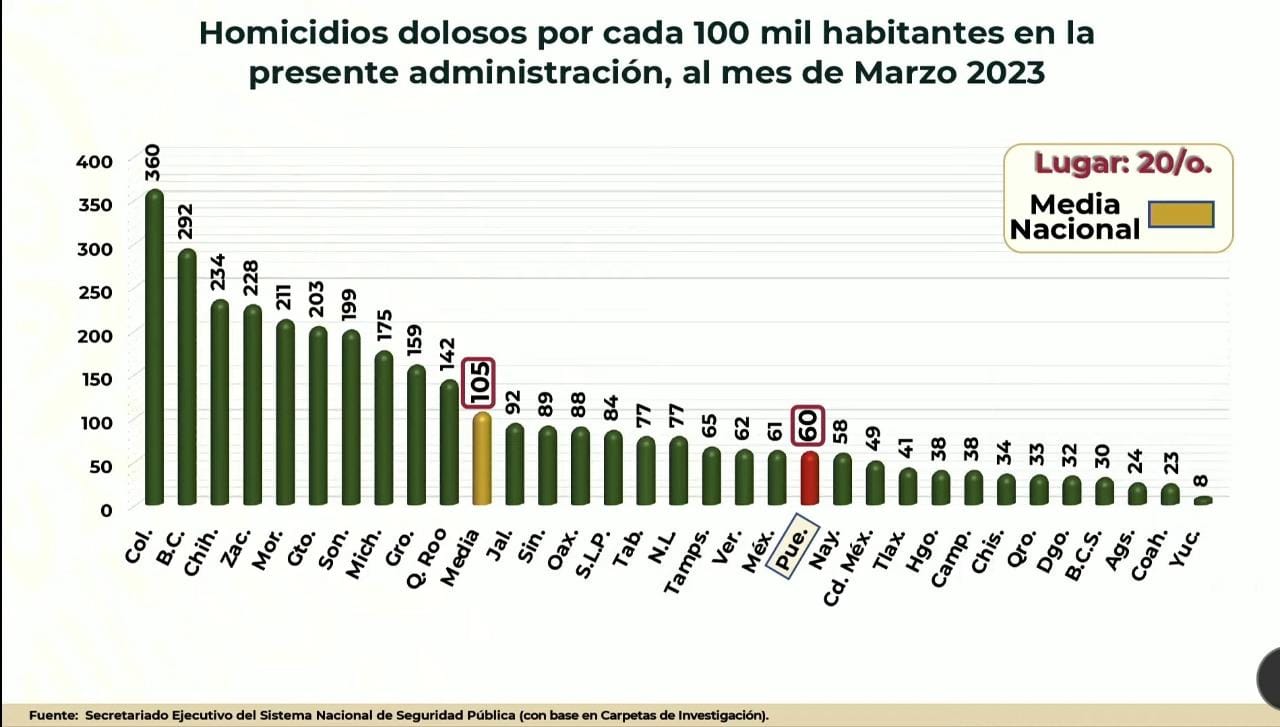 Al respecto de la tasa de homicidios por cada 100 mil habitantes, el presidente dio a conocer un dato del Secretariado Ejecutivo del Sistema Nacional de Seguridad Pública (SESNSP), el cual posiciona a San Luis Potosí en el lugar número 15 de estados con mayor número de homicidios.