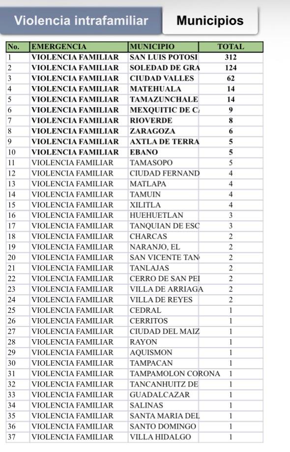 A nivel municipal, la capital potosina se posiciona como el principal foco rojo, con 312 llamadas al 911 por violencia familiar, lo que representa el 51 por ciento del total estatal. Soledad de Graciano Sánchez ocupa el segundo lugar con 124 reportes, equivalentes al 20 por ciento.