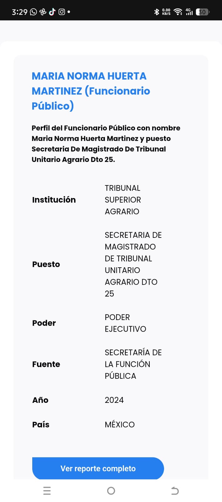 La red de tráfico de influencias no para ahí. Sandoval Huerta es hijo de María Norma Huerta Martínez, en cuya ficha como servidora pública aparece como “secretaria de Magistrado de Tribunal Unitario Agrario Dto. 25”, es decir, es la secretaria de la magistrada María de Lourdes Martínez Lastiri, a quien se menciona en el audio como “amarrada contra el cuello”.