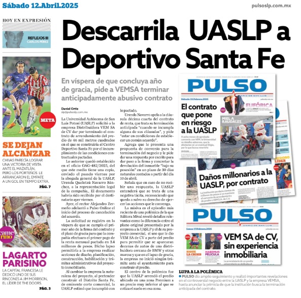 Dos. Tras más de seis meses de haber sido emplazado para rescindir el contrato de arrendamiento de un terreno universitario en Las Lomas Cuarta Sección por incumplimientos, Fabián Espinosa Díaz de León, director de la empresa VEMSA, reapareció en una amplia entrevista en el periódico Pulso, a plana entera, para anunciar “El contrataque de VEMSA a la UASLP”.