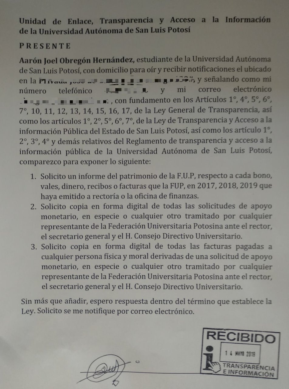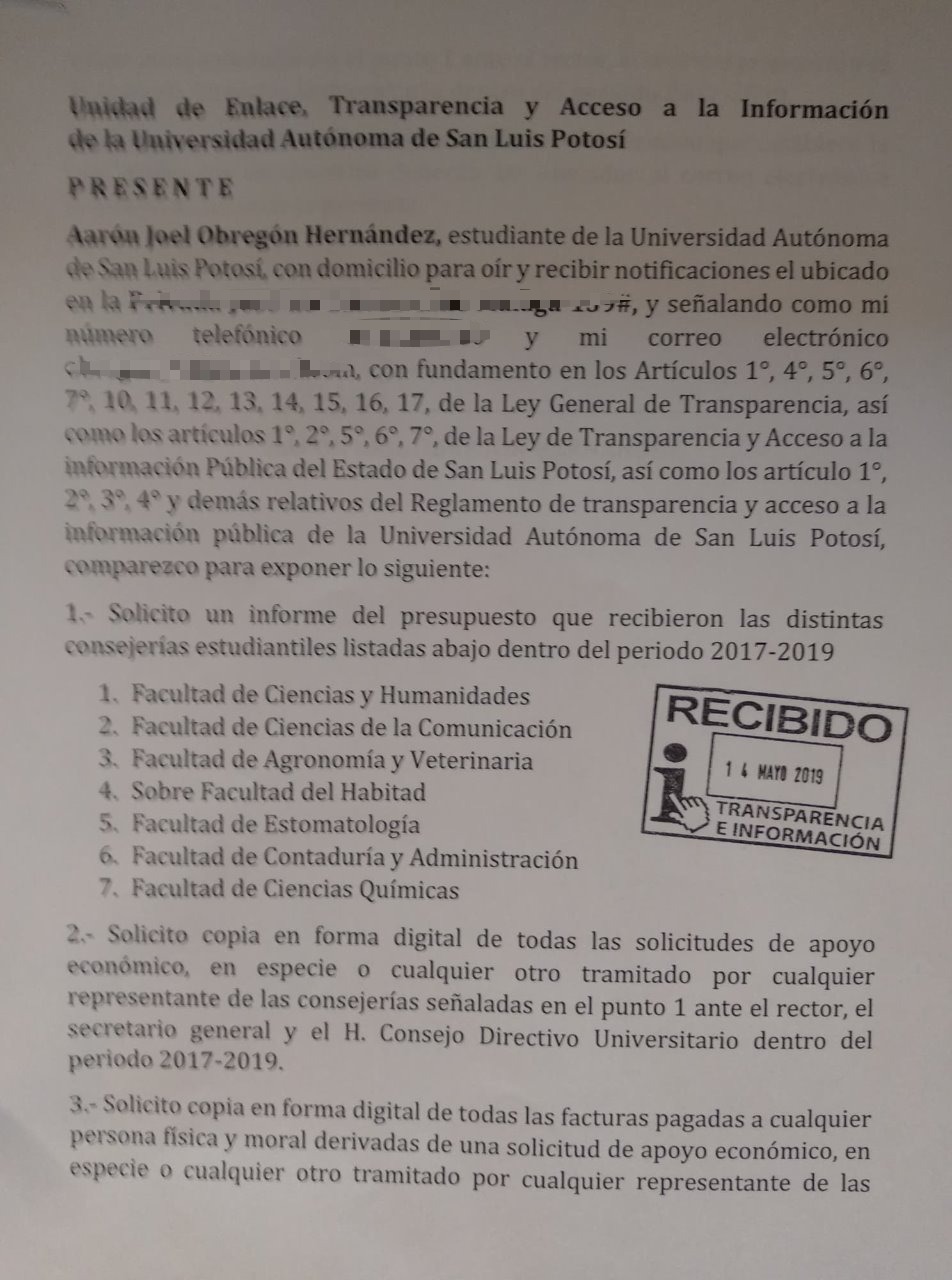 En la Unidad de Enlace de Transparencia de la UASLP entregaron dos solicitudes de información para conocer los montos de bonos, vales y cualquier tipo de apoyo que hubieran recibido las consejerías de las facultades de Ciencias y Humanidades, Ciencias de la Comunicación, Agronomía y Veterinaria, Hábitat, Estomatología, Contaduría y Administración, Ciencias Químicas y la Federación Universitaria Potosina durante el periodo 2017-2019.