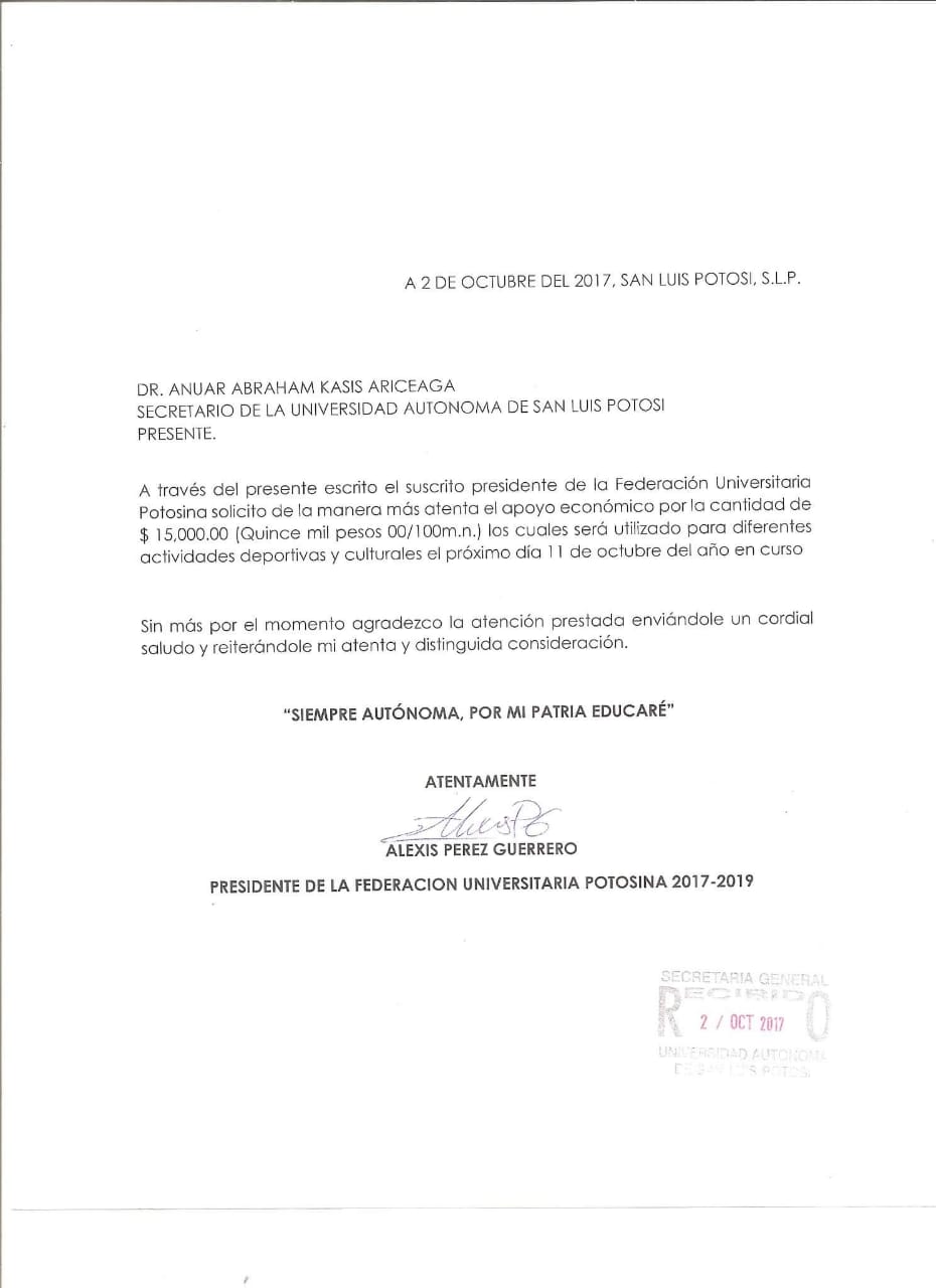 Lo anterior, luego de que, en marzo de éste año, dentro del periodo de renovación de consejerías, fueran difundidos cerca de 30 escritos firmados por el presidente de la FUP Alexis Pérez Guerrero y dirigidos al rector, Manuel Fermín Villar Rubio o al secretario general, Anuar Abraham Kasis, para solicitar diversos apoyos económicos y en especie para realizar distintas actividades.