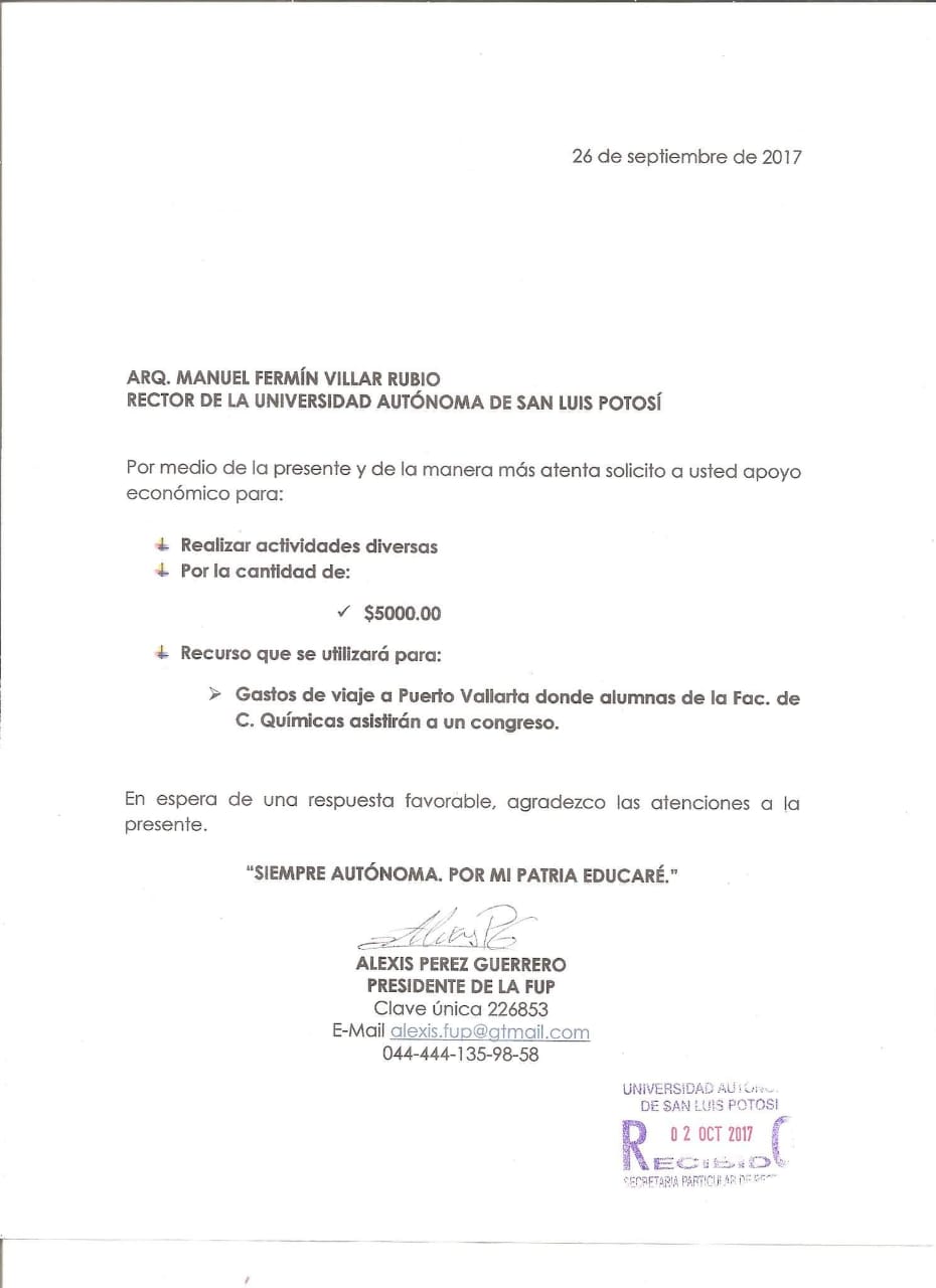 En una de las cartas, con fecha de 2 de octubre de 2017, el presidente de la FUP pidió 15 mil pesos para llevar a cabo “diferentes actividades deportivas y culturales”. A finales de ese mismo mes, solicitó otros 15 mil pesos para “diversas actividades, sociales, culturales y deportivas”. Un mes antes, requirió cinco mil pesos para cubrir “gastos de viaje a Puerto Vallarta” al que supuestamente asistirían alumnas de la Facultad de Ciencias Químicas con motivo de un congreso.