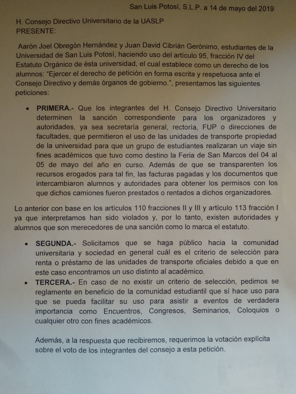 Estudiantes de la Universidad Autónoma de San Luis Potosí (UASLP) presentaron un escrito ante el Consejo Directivo Universitario para solicitar que se aplique una sanción al rector, al secretario general, a los directores de las facultades y a los alumnos involucrados en la autorización y utilización de autobuses propiedad de la Universidad para trasladar un grupo de estudiantes a la Feria de San Marcos los días 4 y 5 de mayo.