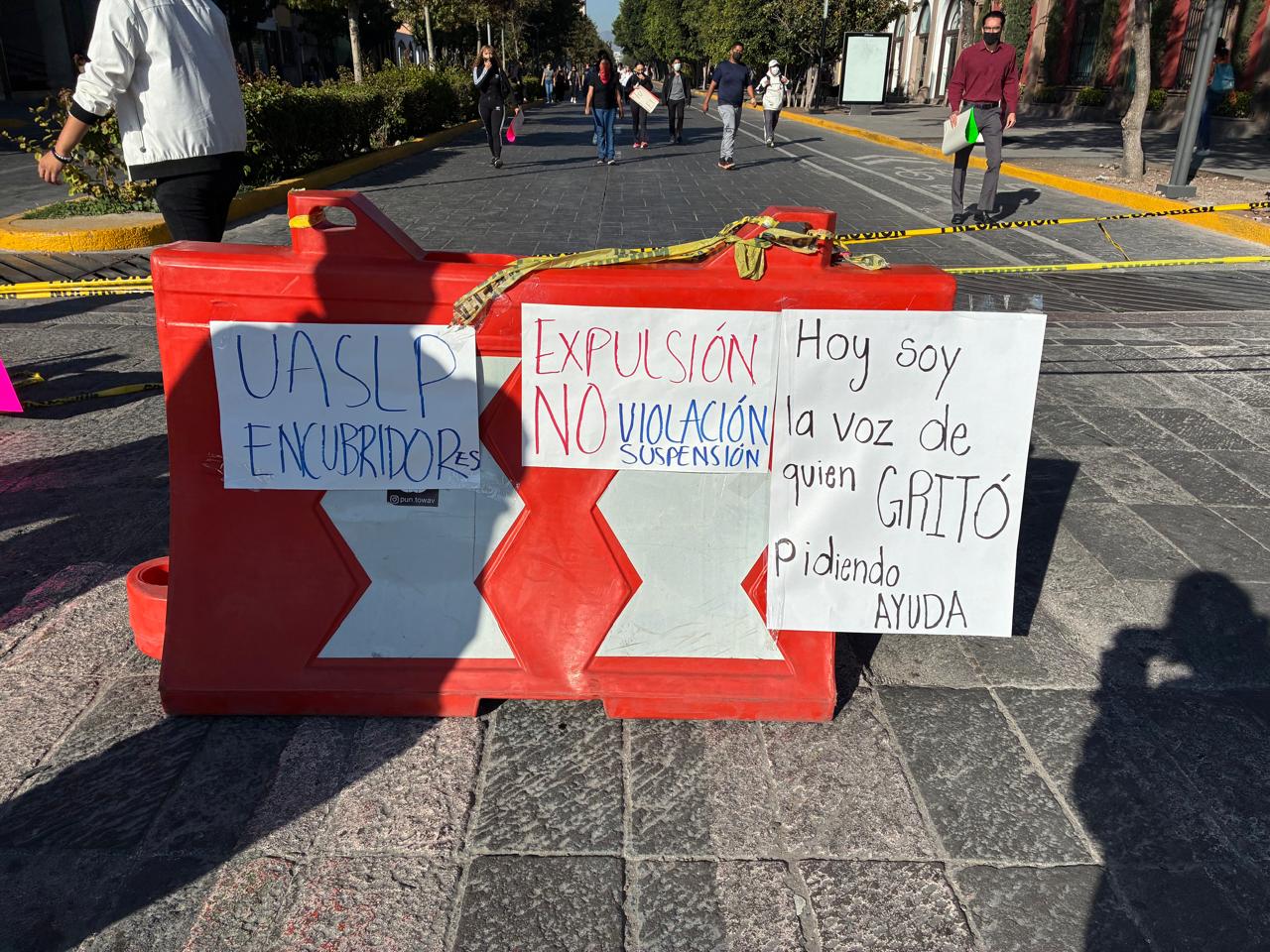 A las ocho de la mañana, los primeros contingentes comenzaron a reunirse frente a los edificios de la Facultad de Derecho y de Contaduría y Administración; llegaron con carteles improvisados, otros con mantas que llevaban horas preparando. En los muros se leían frases escritas a mano: “No fue un caso aislado”, “La UASLP también es responsable”, “Si tocan a una, respondemos todas”.