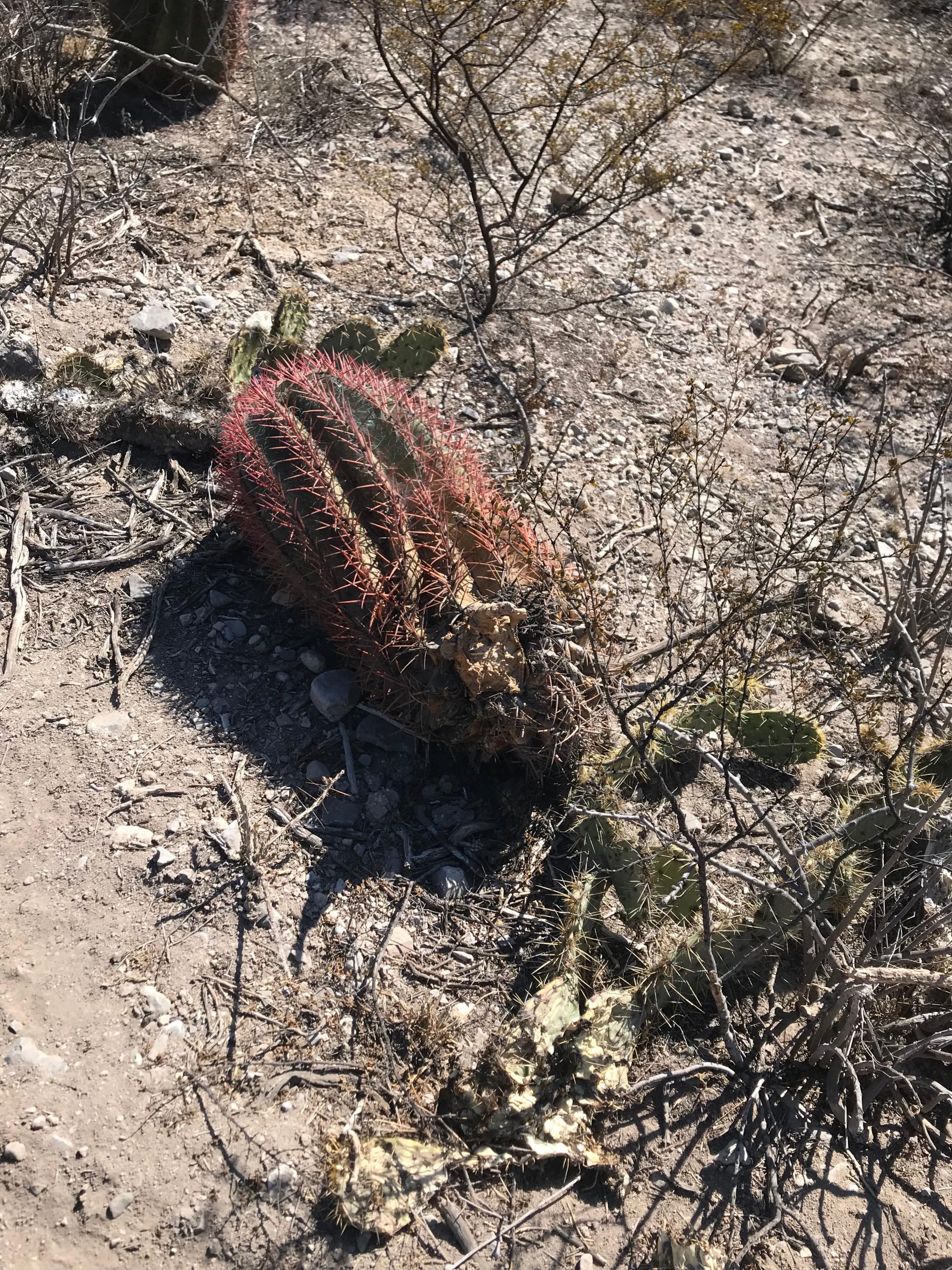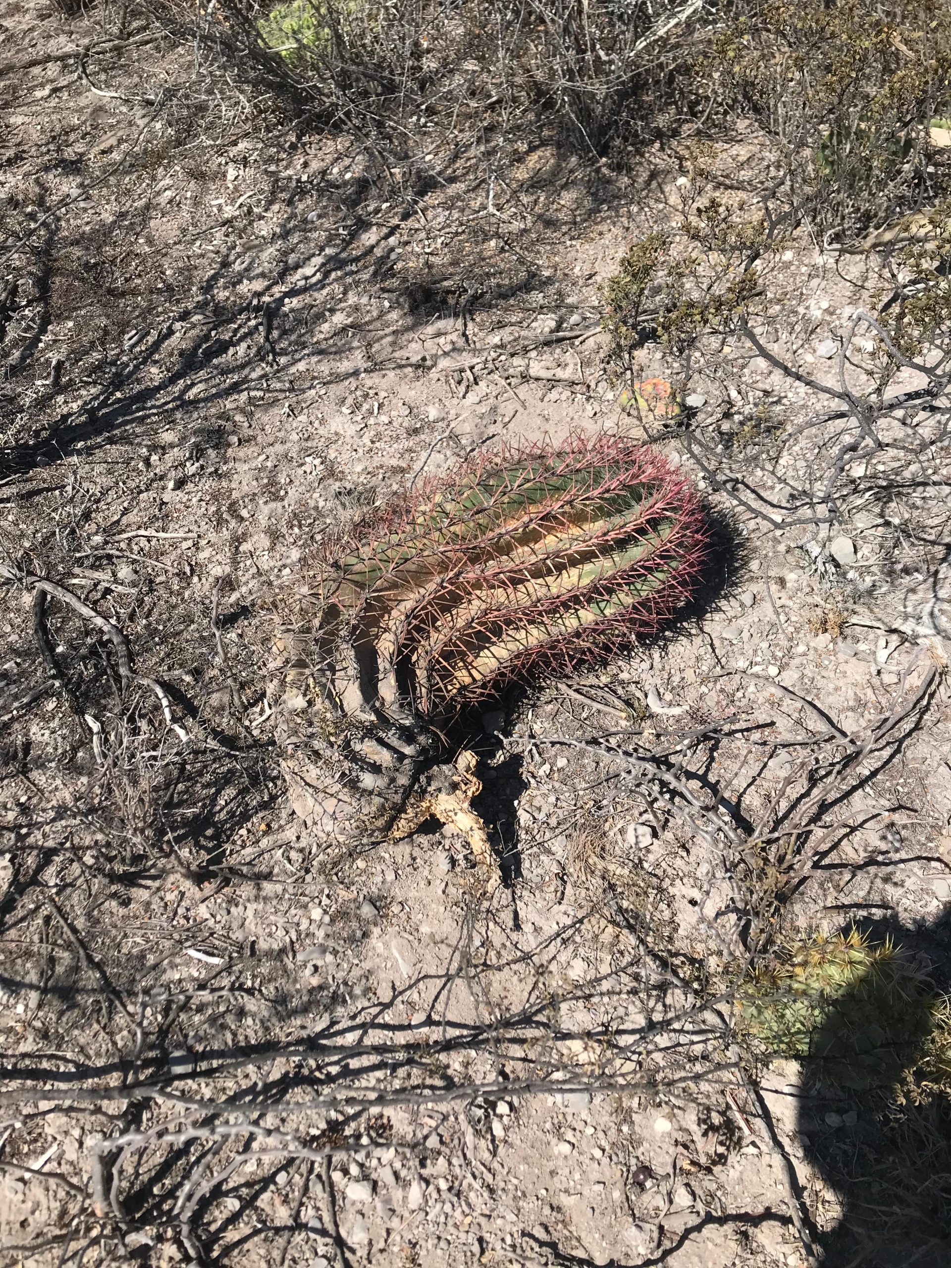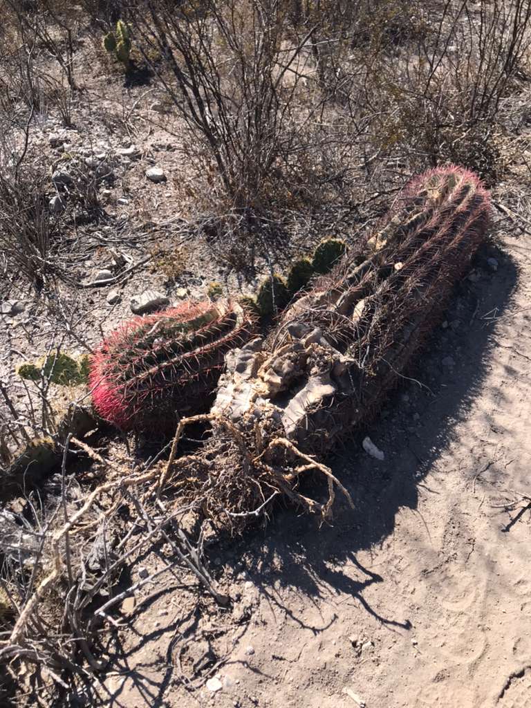 Además, a los costados de donde se realizó la apertura de la brecha, se observaron ejemplares de biznaga barril de lima o roja (Ferocactus pilosus), biznaga burra (Echinocactus plathyacanthus), biznaga barril costillona (Ferocactus haematacanthus), y uno más de la especie Tilandsia sp, y al final un ejemplar de biznaga barril de lima o roja (Ferocactus pilosus), desenterrada aún con indicativos de vida.
