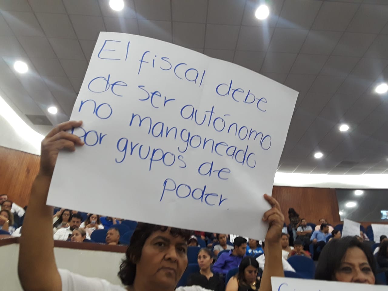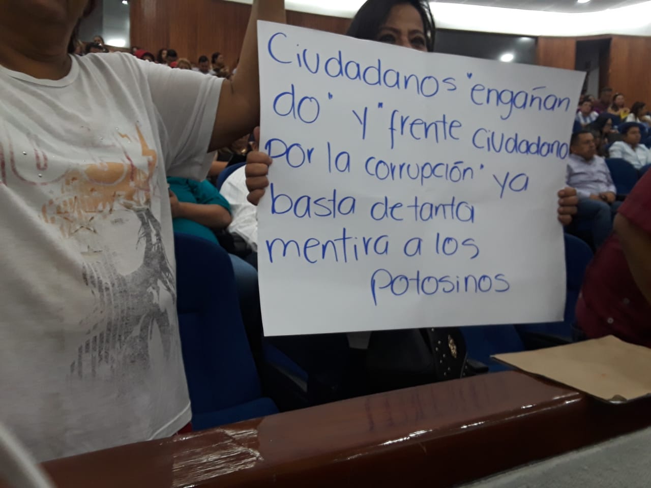 Además, se presentó otro grupo pequeño de manifestantes, quienes, cada vez que Garza Herrera tomaba la palabra, le cantaban: “a la rorro niño, duérmete mi pueblo….”, y portaban pancartas con leyendas que coincidían con las de la mujer entrevistada: “el fiscal debe de ser autónomo, no mangoneado por grupos de poder”, “ciudadanos ‘engañando’ y ‘frente ciudadano por la corrupción’ ya basta de tanta mentira a los potosinos”.